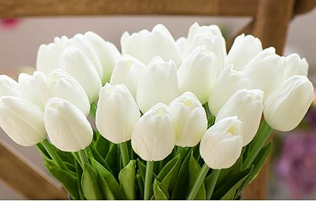 HoveBeaty Artificial Tulips Bouquet – Real Touch White PU Flowers (Pack of 20)