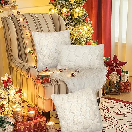 KEOYA Christmas Tree Pillow Covers 2 Pack – Soft Plush Faux Fur Jacquard Cushion Covers, White 40x40 cm Decorative Throw Pillows for Sofa, Bed & Holiday Home Décor