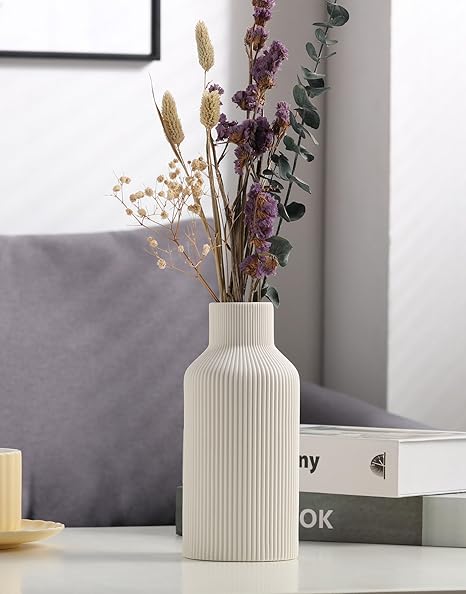 White Ceramic Flower Vase – 8-Inch Minimalist Ribbed Matte Vase for Pampas Grass, Flowers & Modern Home Décor by KIOXOHO
