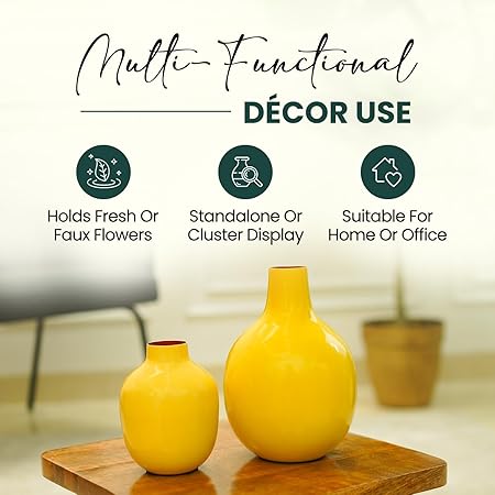 Yellow Metal Flower Vases by Indian Impressions – Handcrafted & Hand-Painted Decorative Vases for Living Room, Office & Gifting (Set of 2)